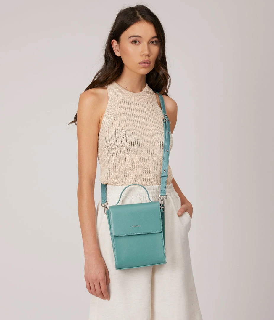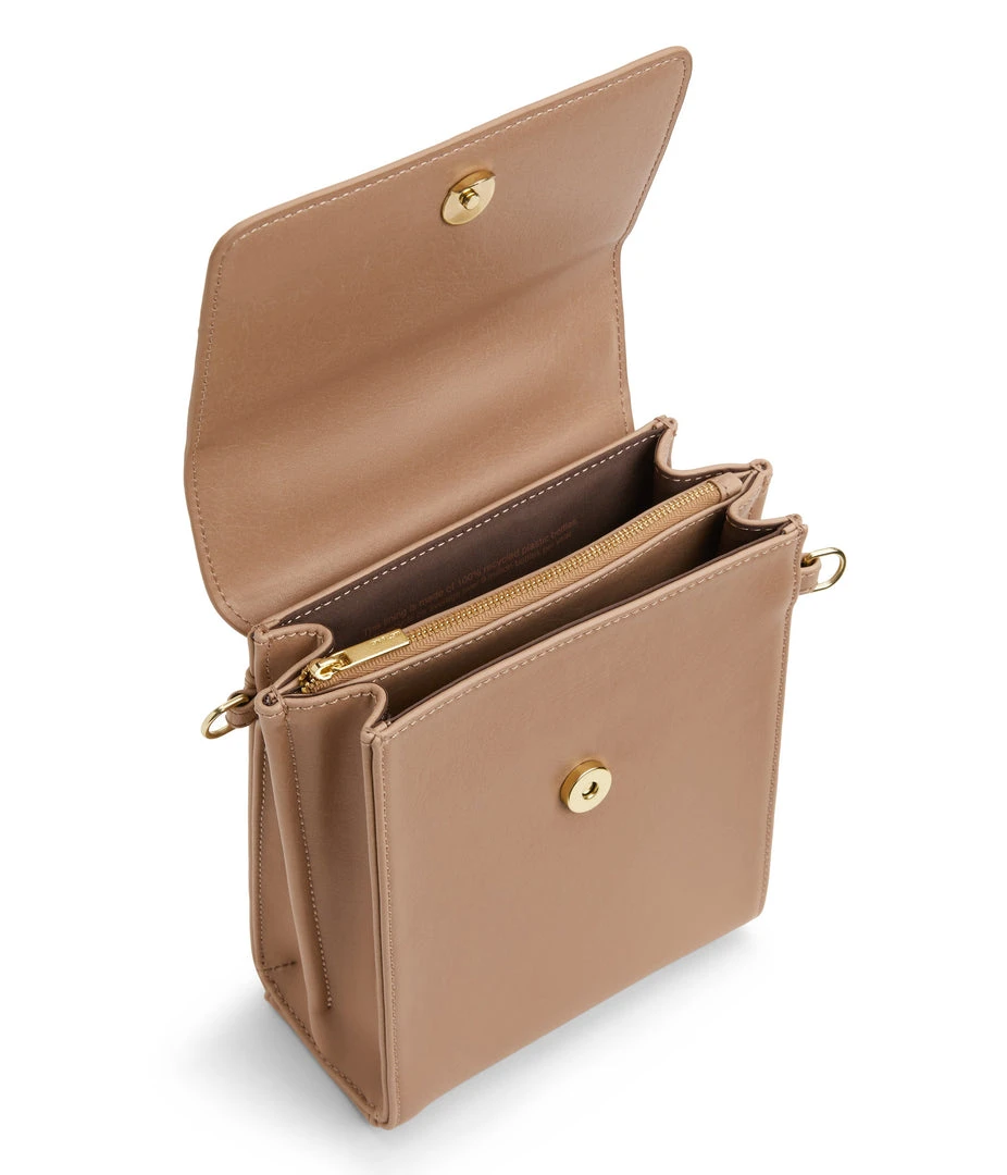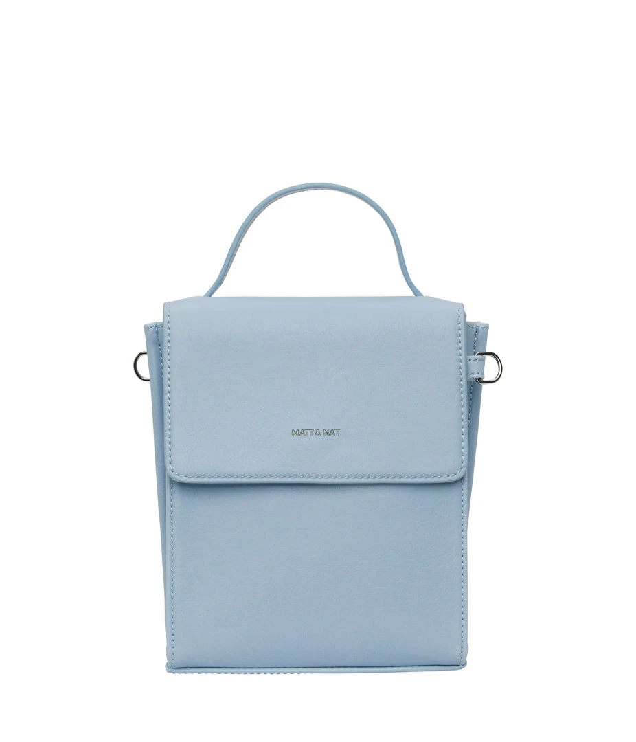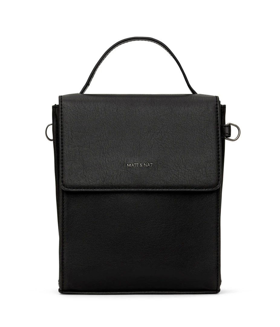 Crossbody bag with triple compartment interior, flap closure with magnetic snap, and top handle to hand-carry. The crossbody strap is adjustable and detachable.