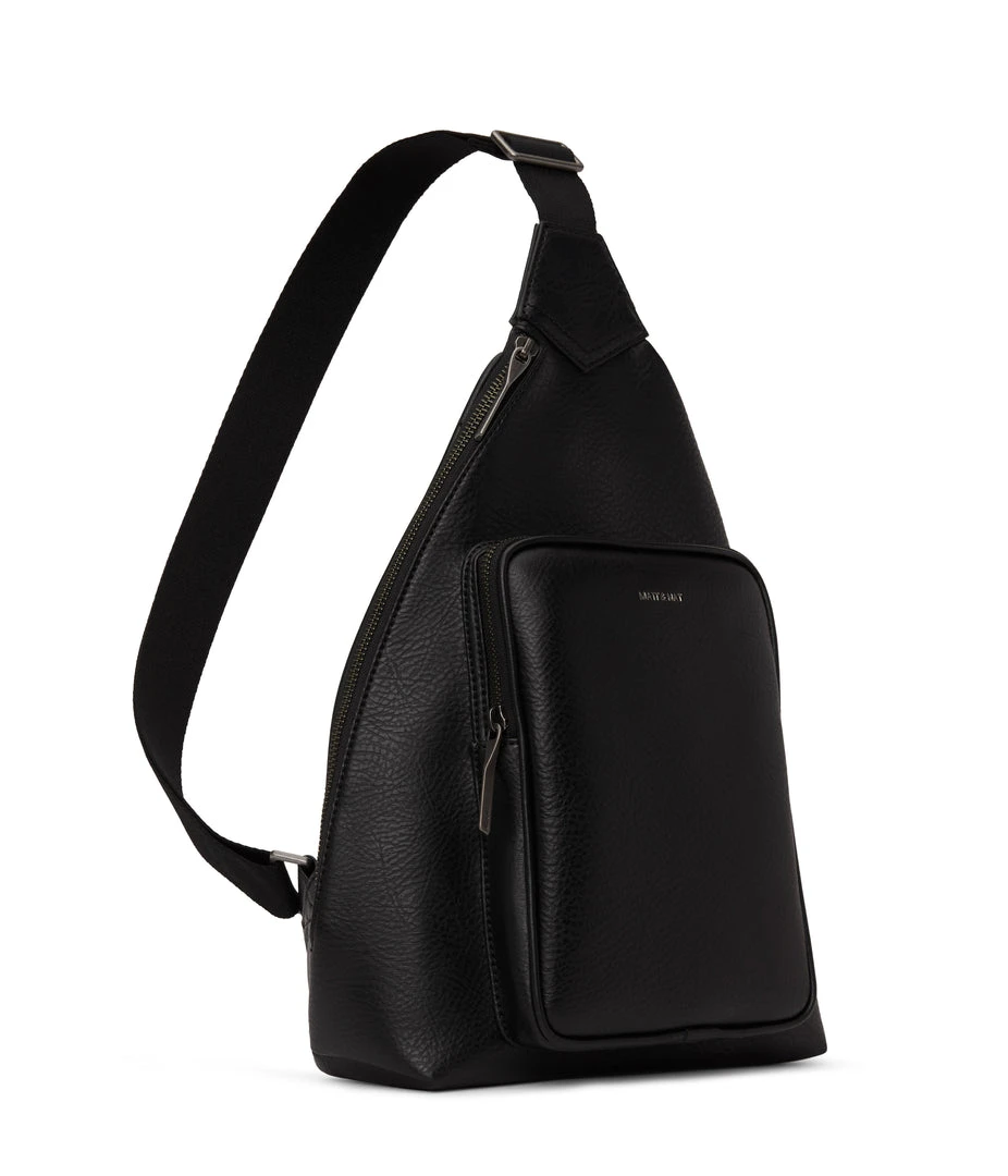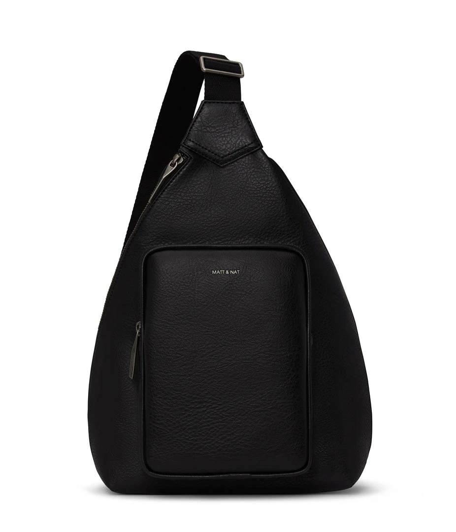 Sling bag with metal zip closure main compartment, front zippered pocket, and an adjustable webbing strap.