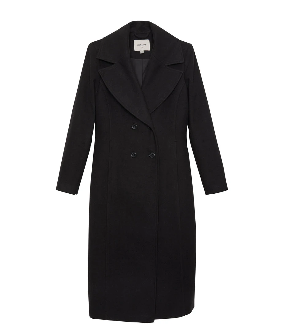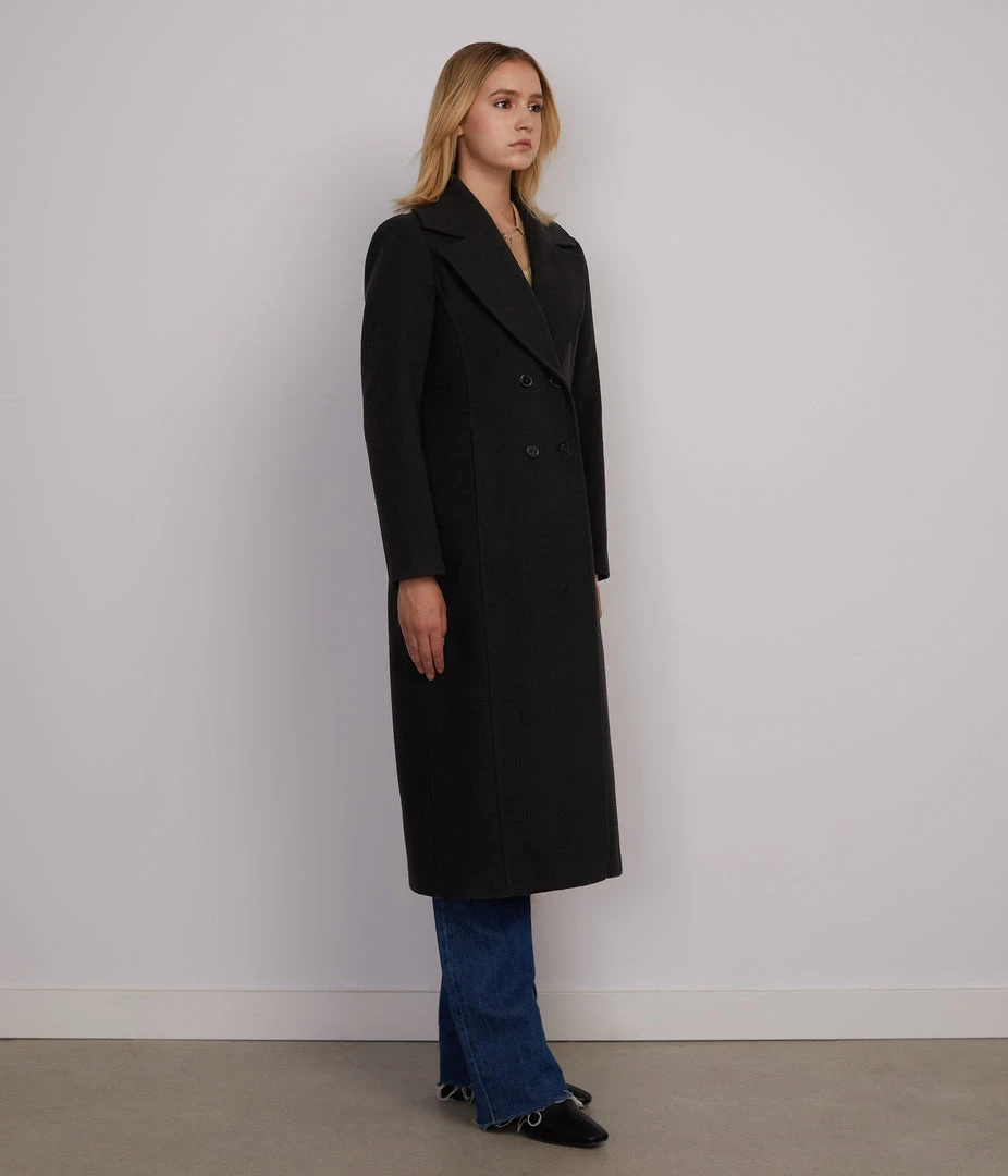 Long sleeve double-breasted coat with large notched lapel collar, princess seams, inseam pockets on the front, internal chest pocket, and center back vent.