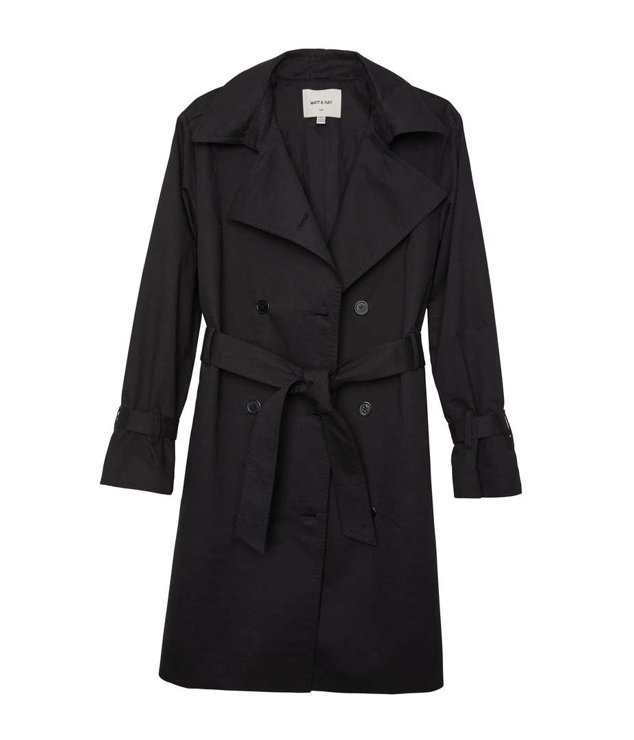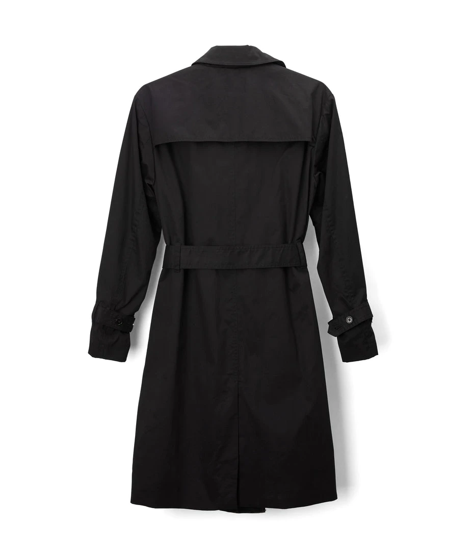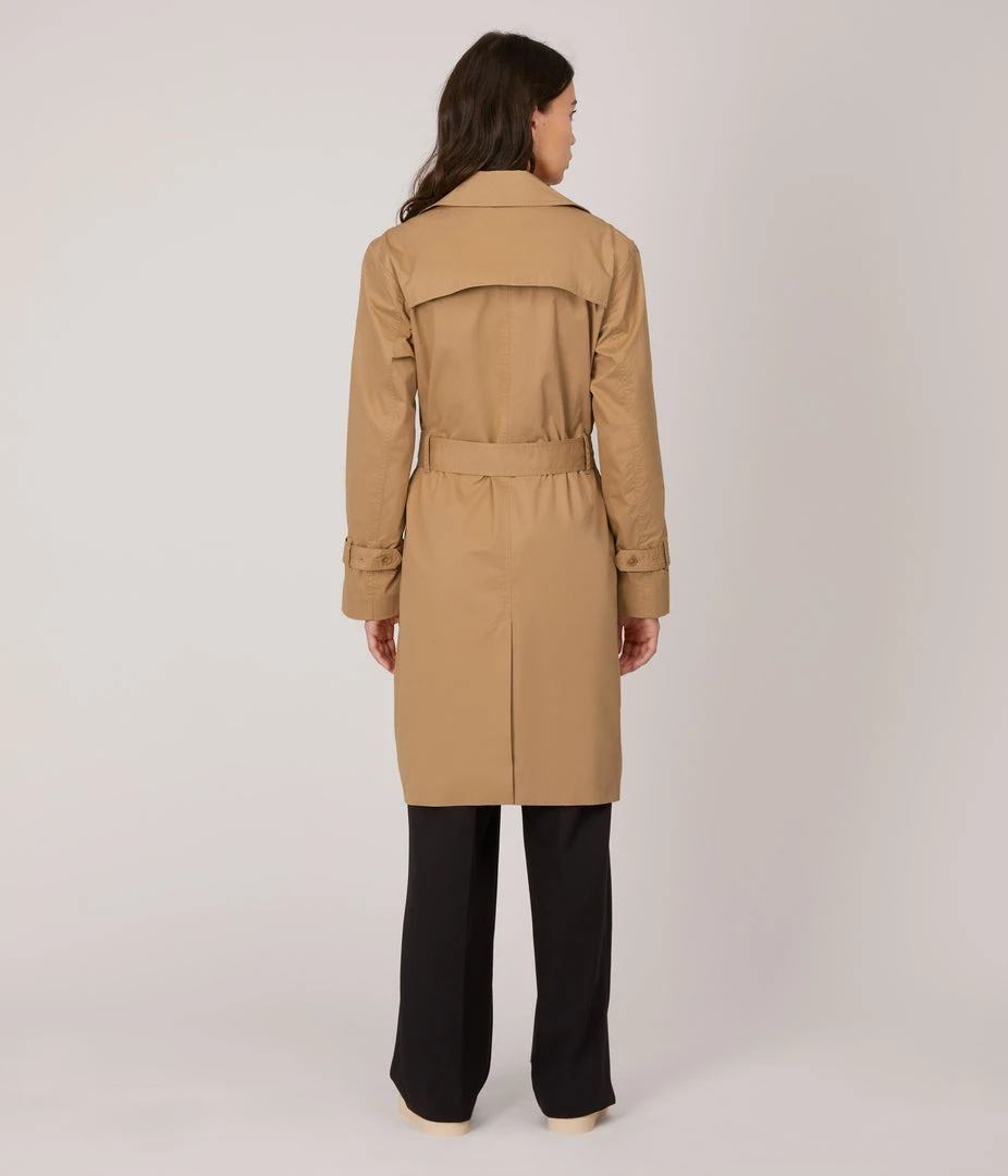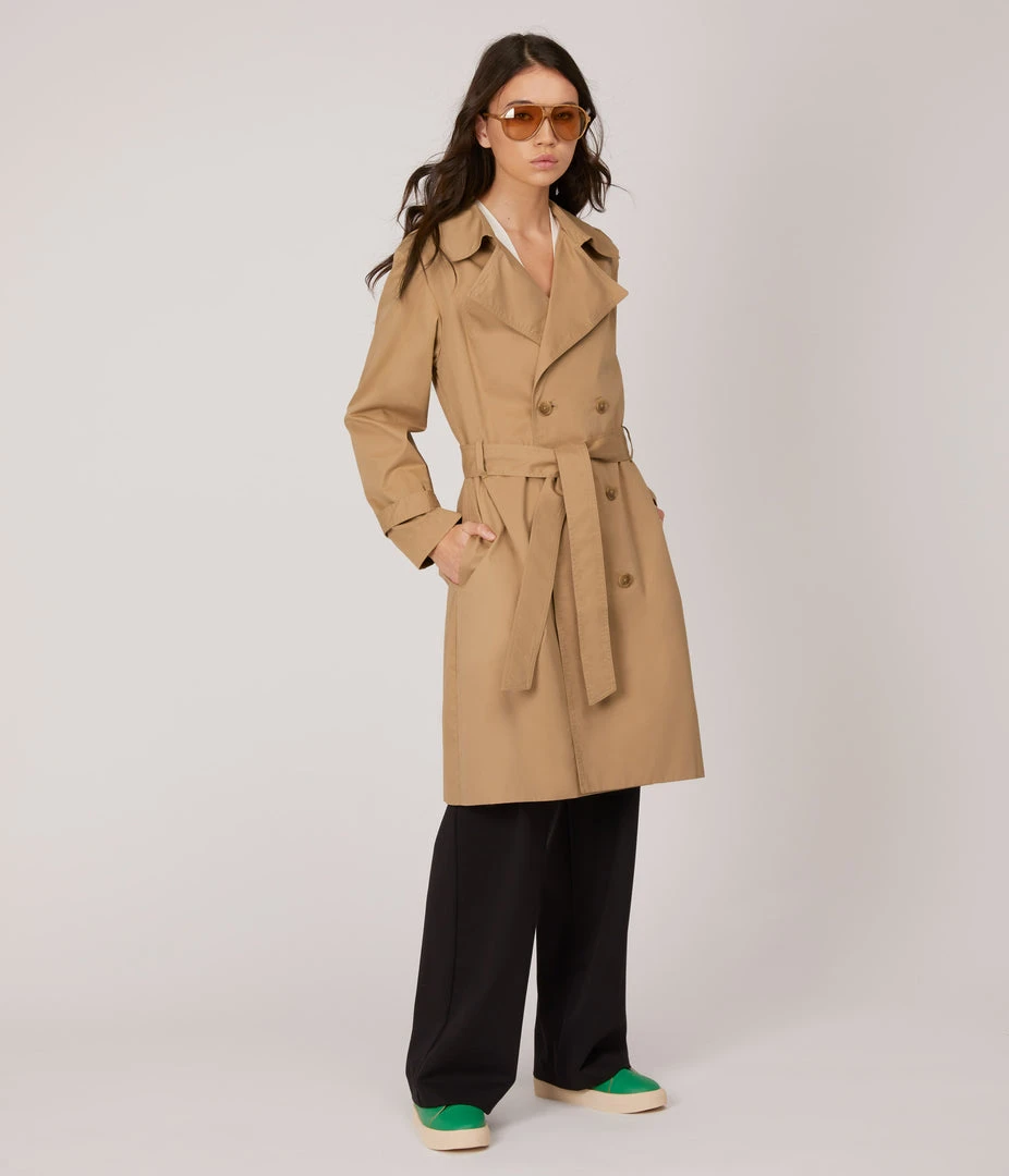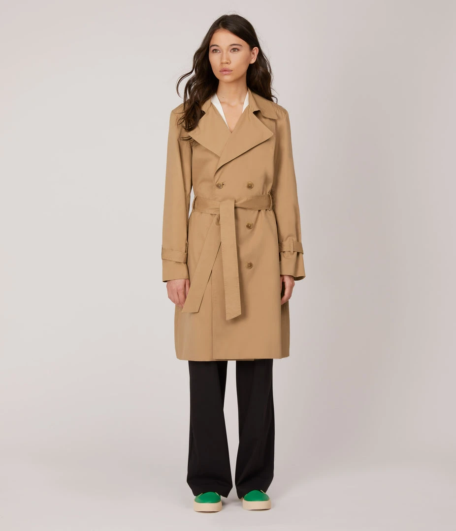 Classic double-breasted trench coat with long sleeves and cuff-belt detail, lapel collar, self-tie belt at the waist, inseam pockets, and center back vent.