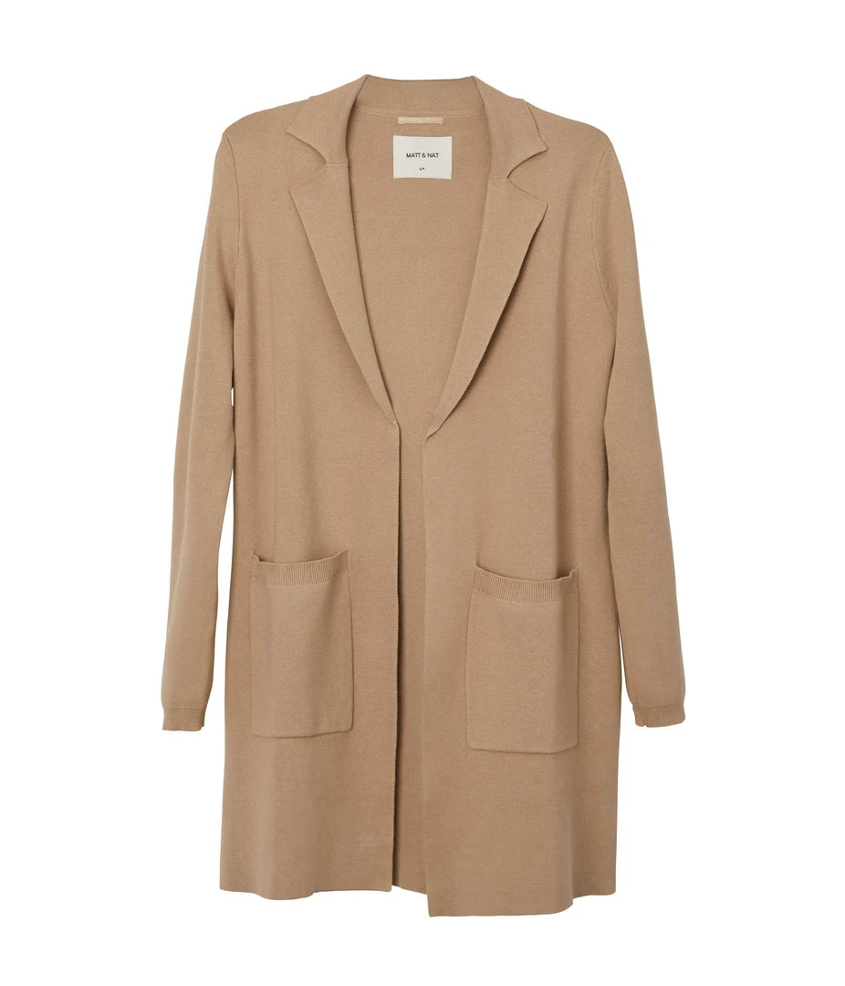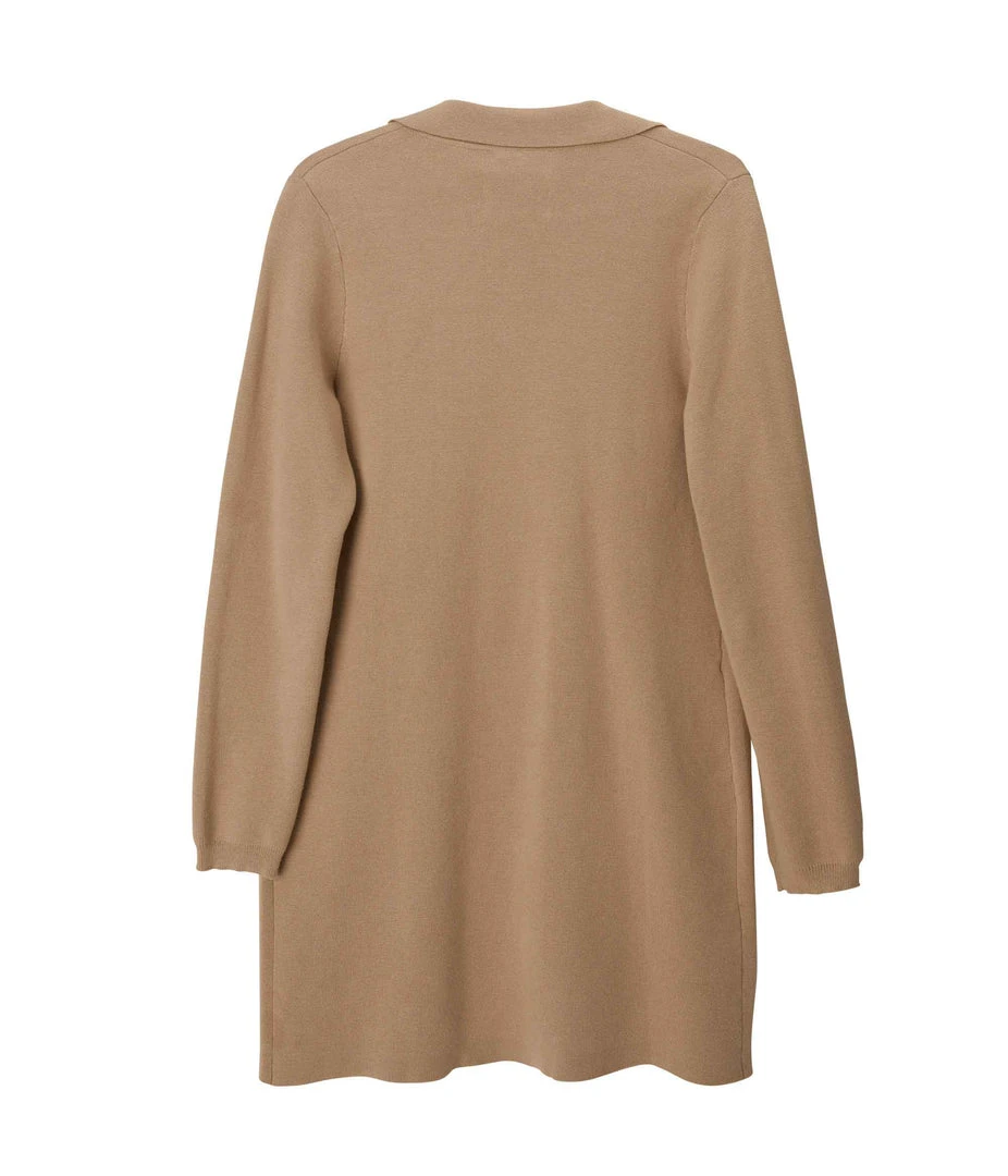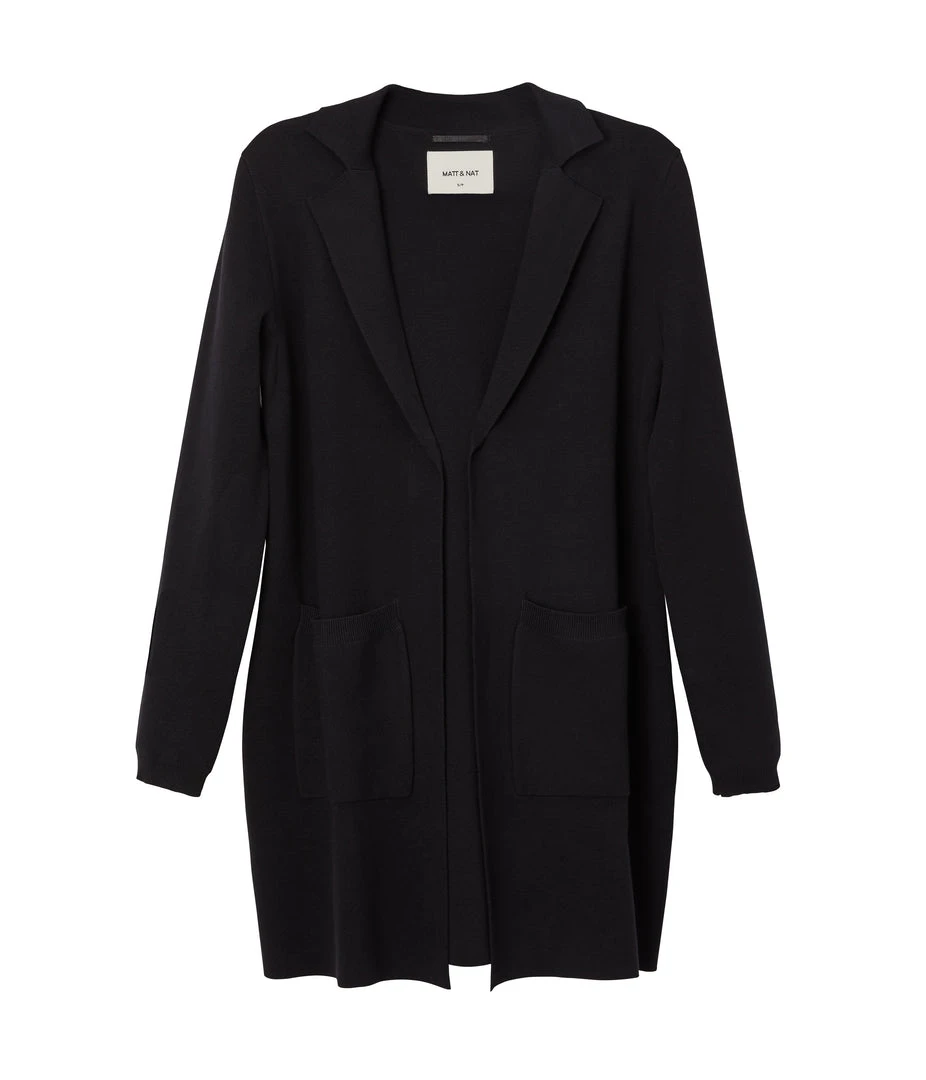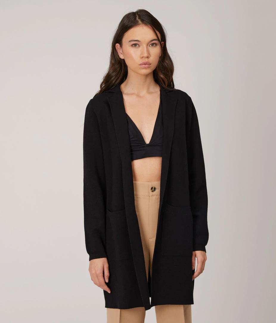 Long-sleeve open-front cardigan with notched lapel, large patch pockets, rib finish at cuffs and pockets.