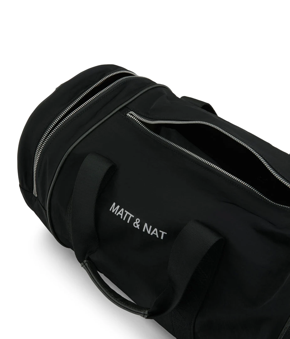Duffle bag with rounded gusset, single side metal zipper pocket and main metal zipper compartment opens all the way to the side. Comes with a removable and adjustable crossbody strap.