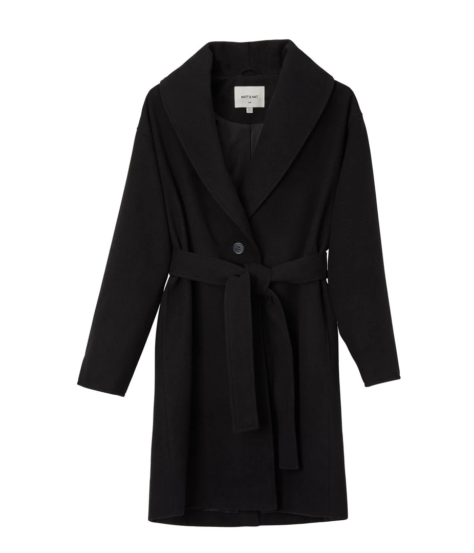Long sleeve dropped shoulder single-button coat with shawl collar, self tie-belt, inseam pockets at waist, internal chest pocket, and center back vent.