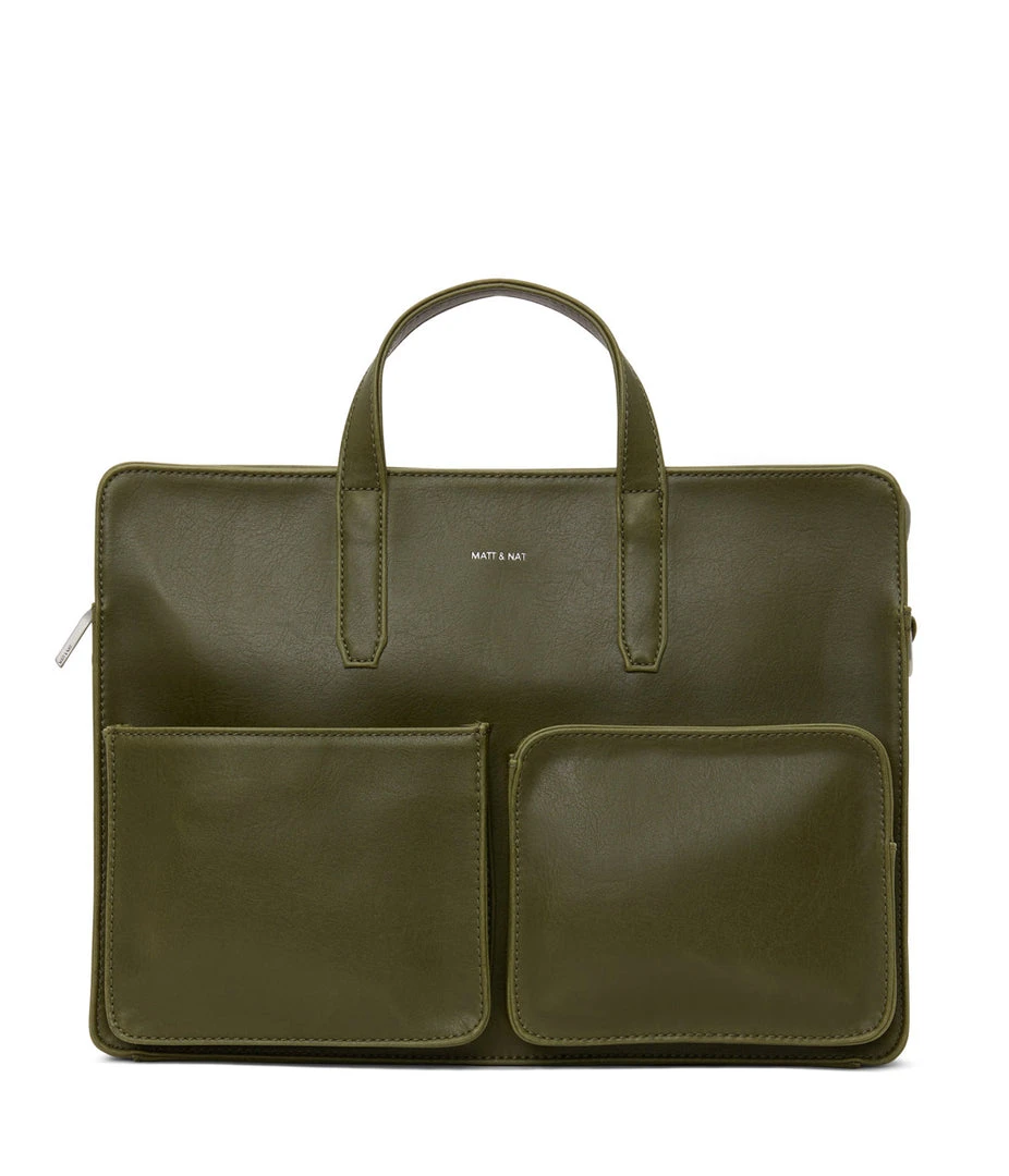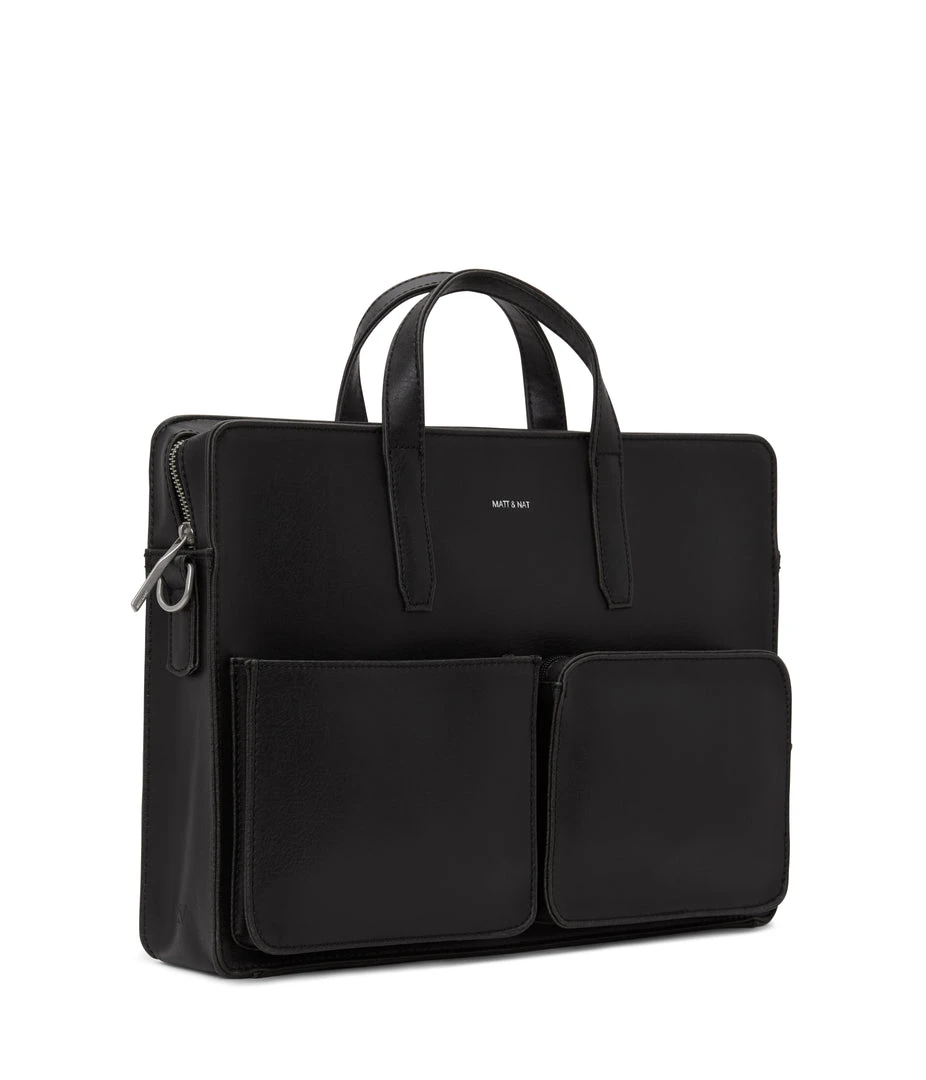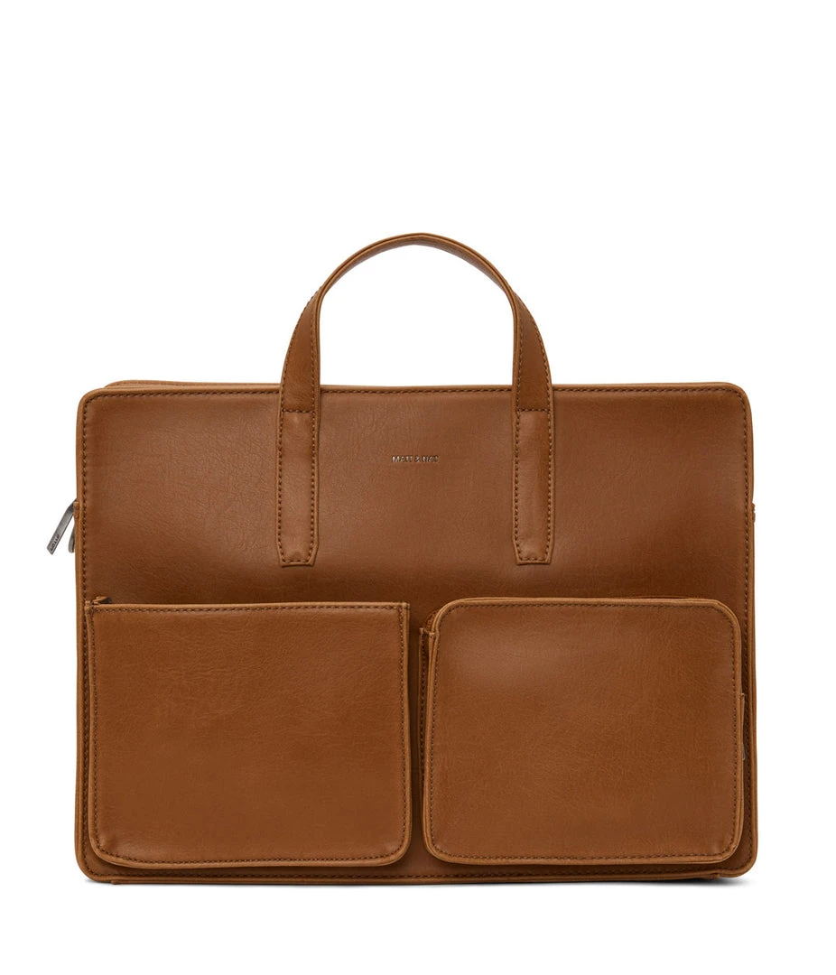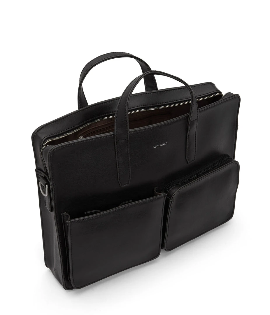 Briefcase with adjustable and removable strap. Top zipper closure. Two front pockets, one with zipper and one with snap closure. Fits both 13” & 15” laptops.