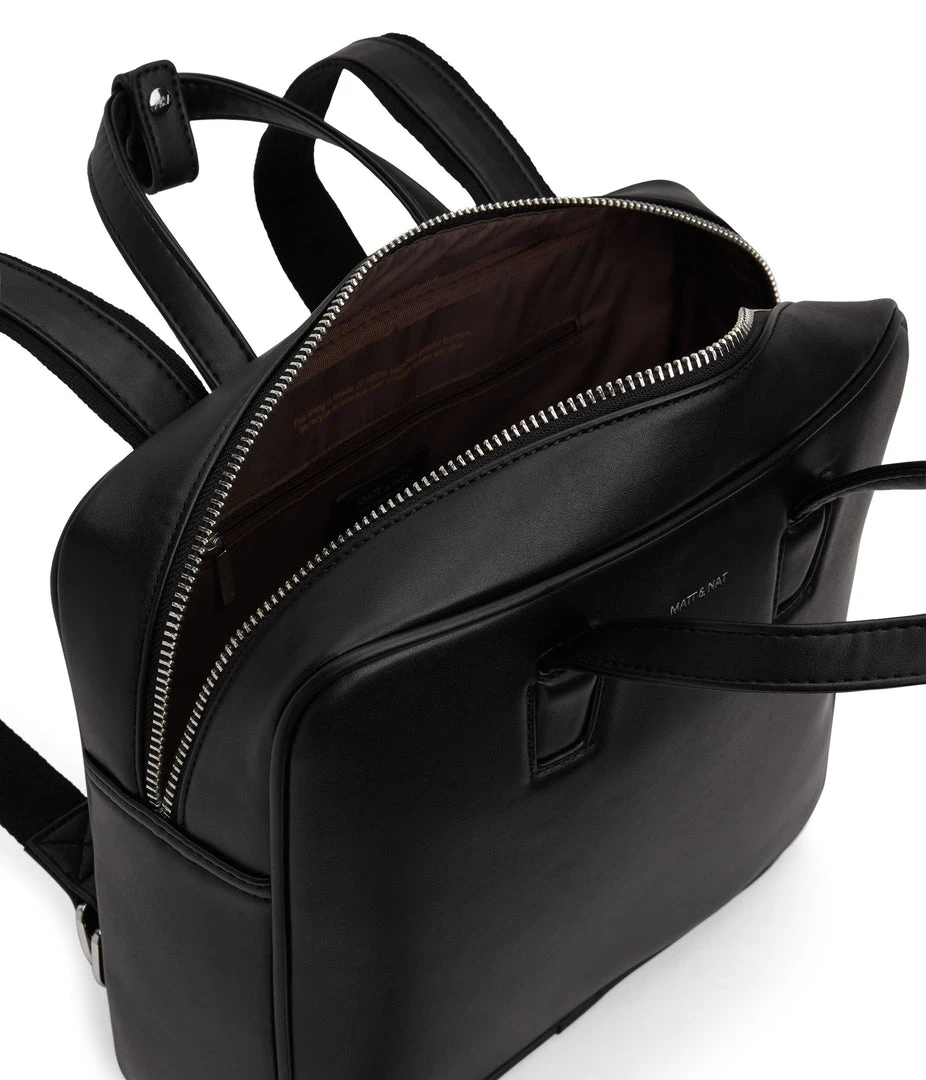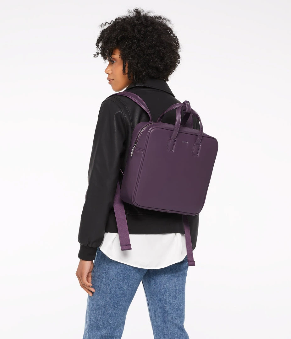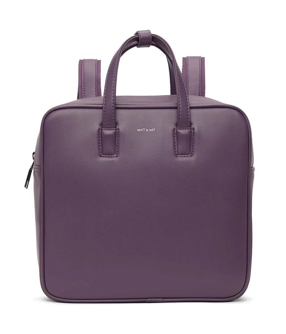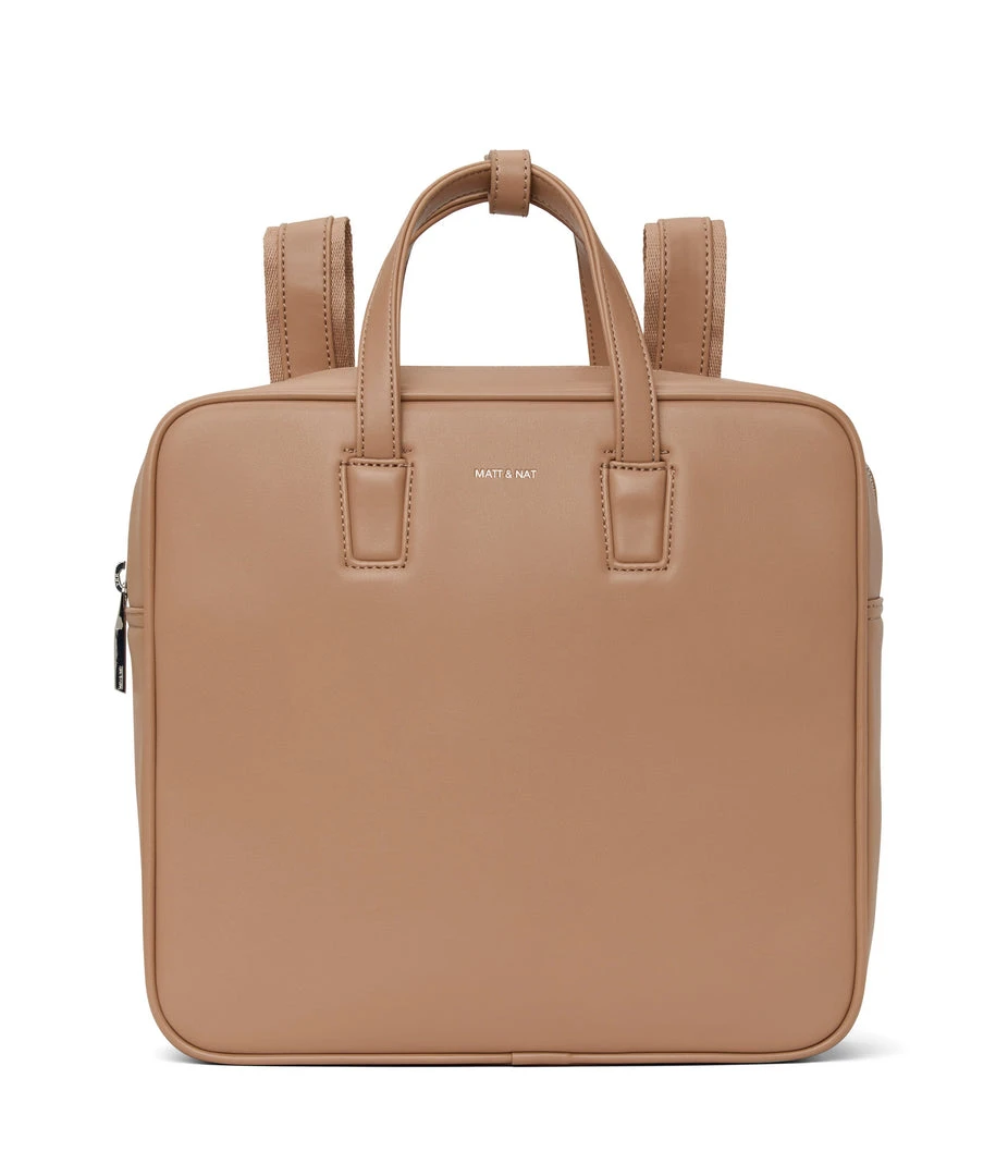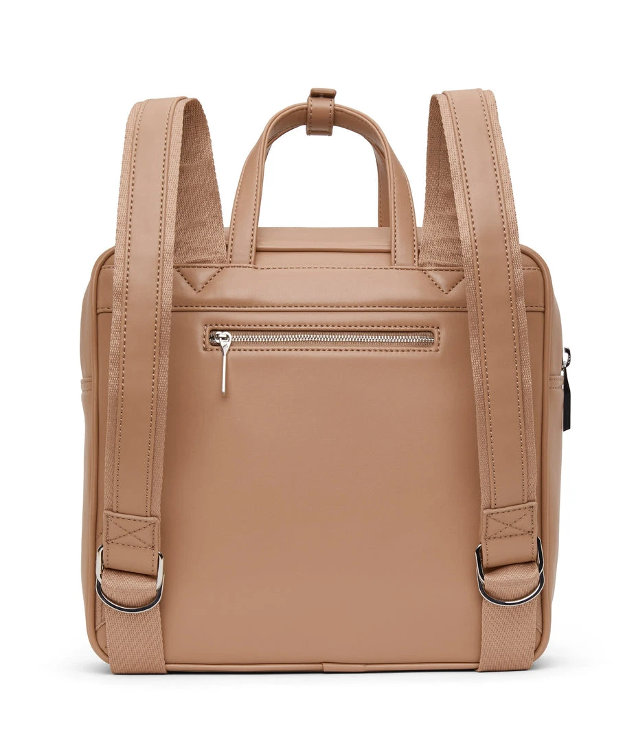 Backpack with top zipper main closure, double handles to hand carry, adjustable back straps, and zipper pocket on exterior back.