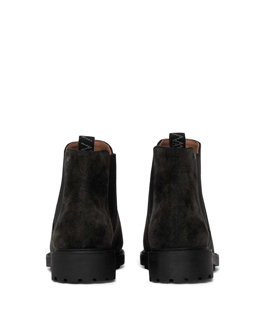 Women’s faux suede Chelsea boot with elastic gore and MN rivet detail.Â
