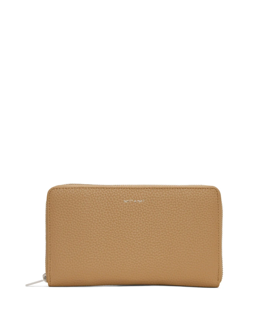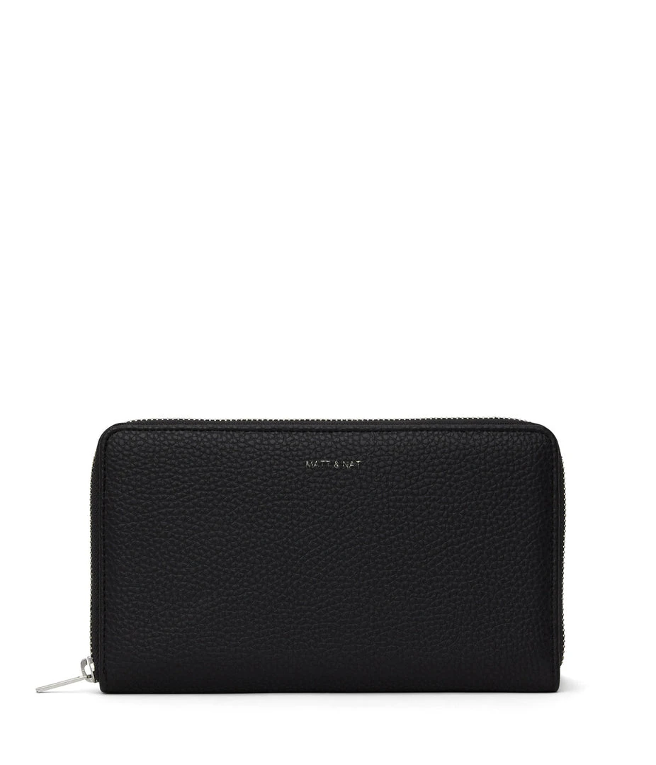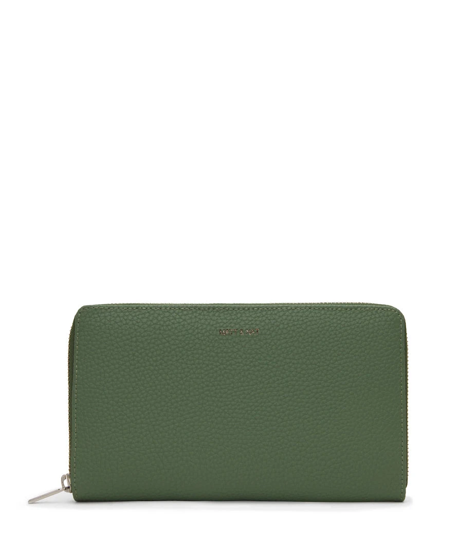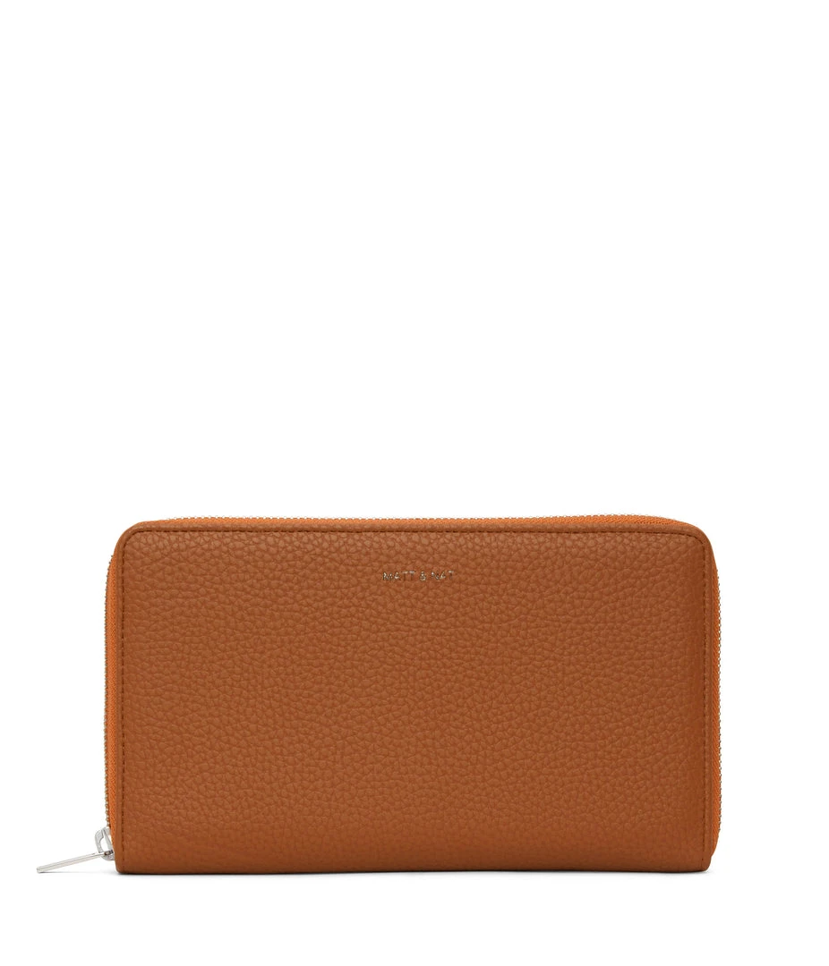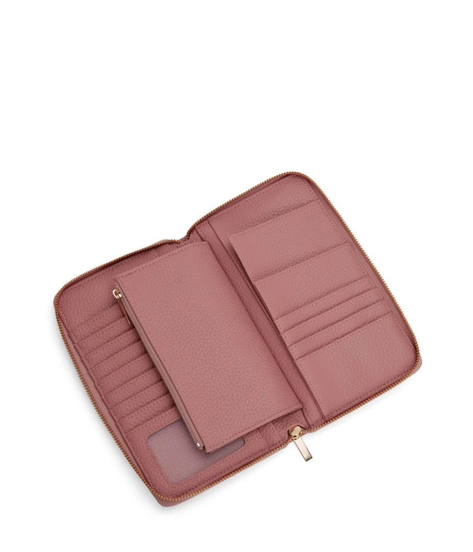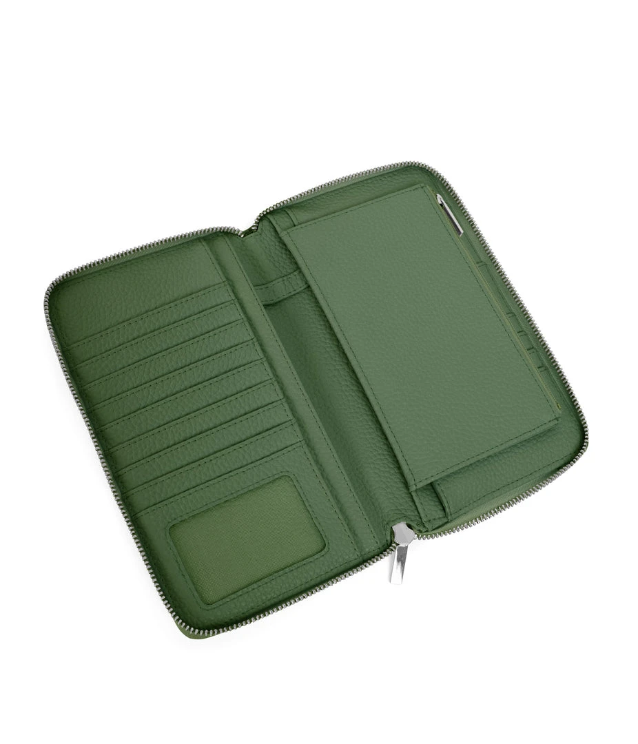 - Interior: 13 card slots, 3 bill compartments, passport slot, chequebook slot, zipper coin pouch.