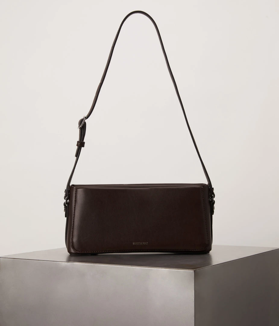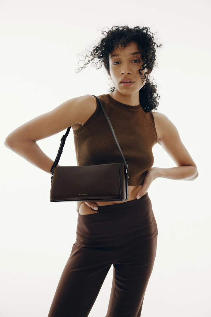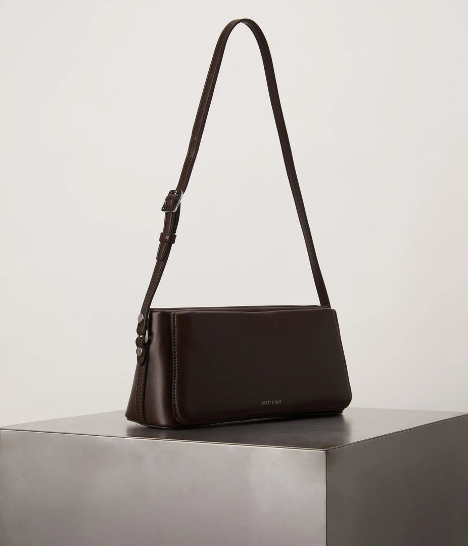 Shoulder bag with a zippered main compartment and a front slip compartment with magnetic snap closure, and skinny adjustable strap.