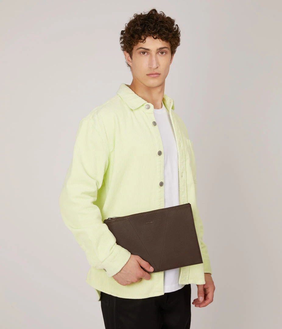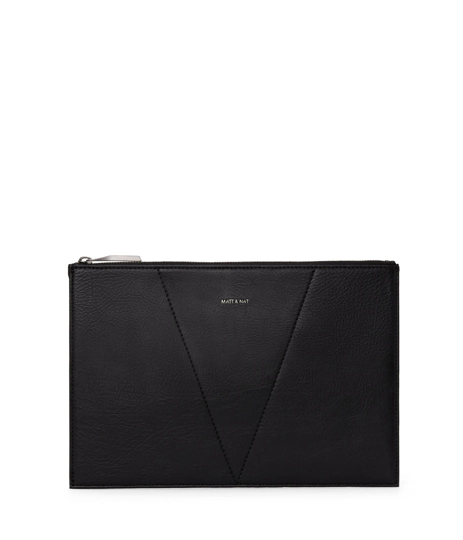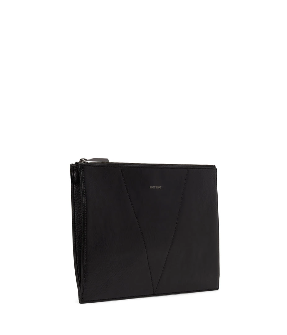 Pouch with top zip closure and gusseted side detail.