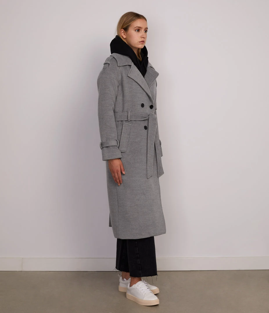 Double-breasted long coat with self-tie belt, belted sleeve cuff detail, large shoulder tabs, welt pockets, center-back vent, and internal chest pocket.