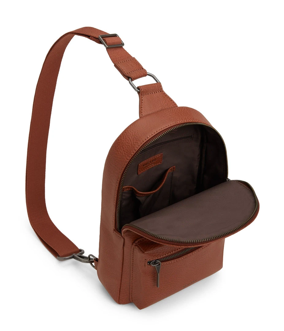Sling bag with metal zip closure and an adjustable webbing strap that unhooks at the bottom for easier wear. Front gusseted pocket with metal zip closure.