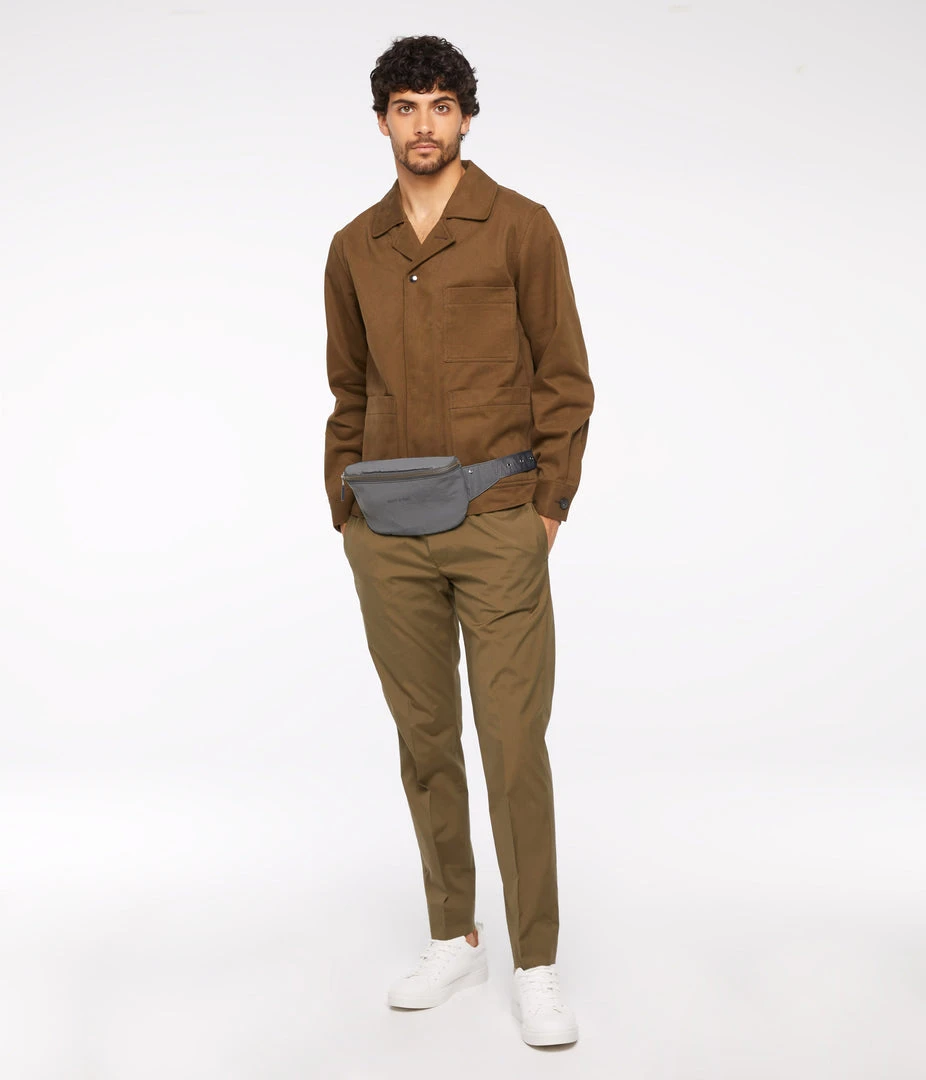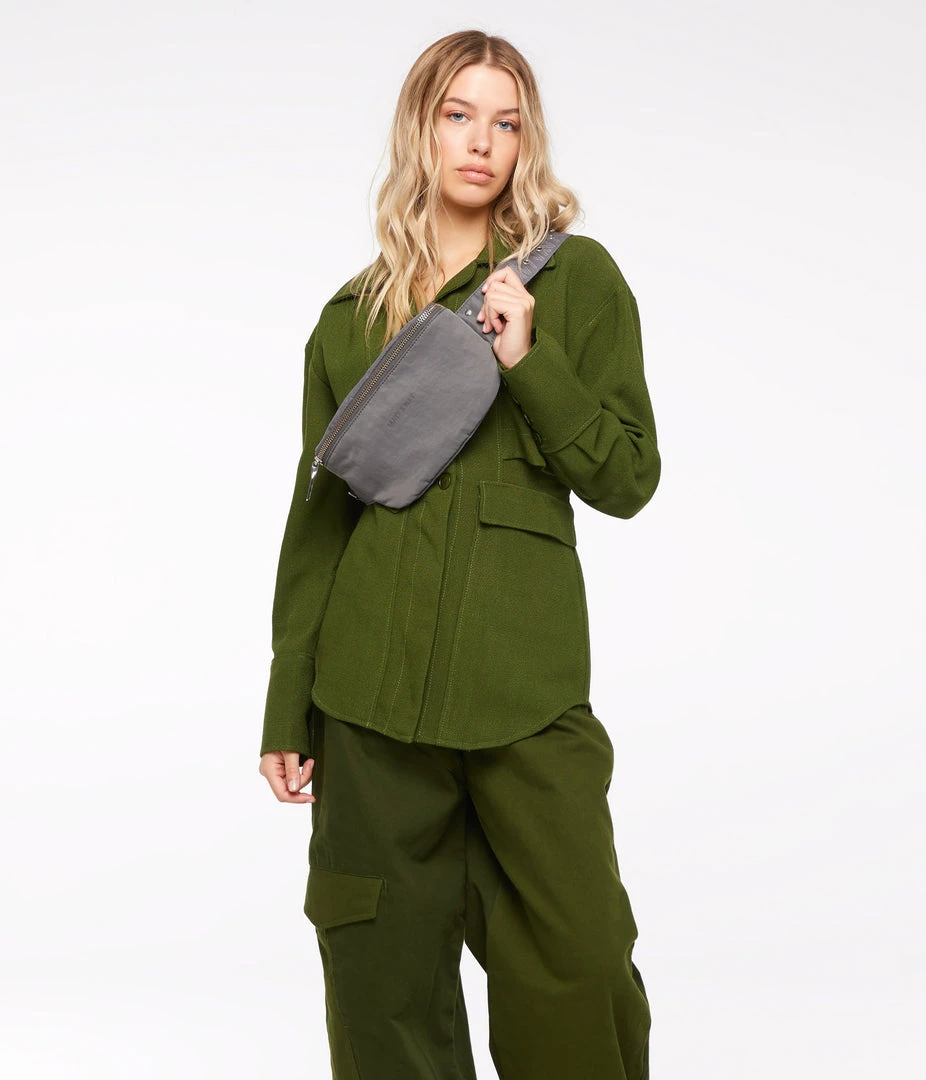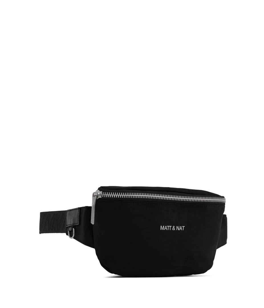 Belt bag with metal zipper main opening and buckle belt attachment for comfortable wear around the waist. D-ring hardware detailed patch with logo embossing.