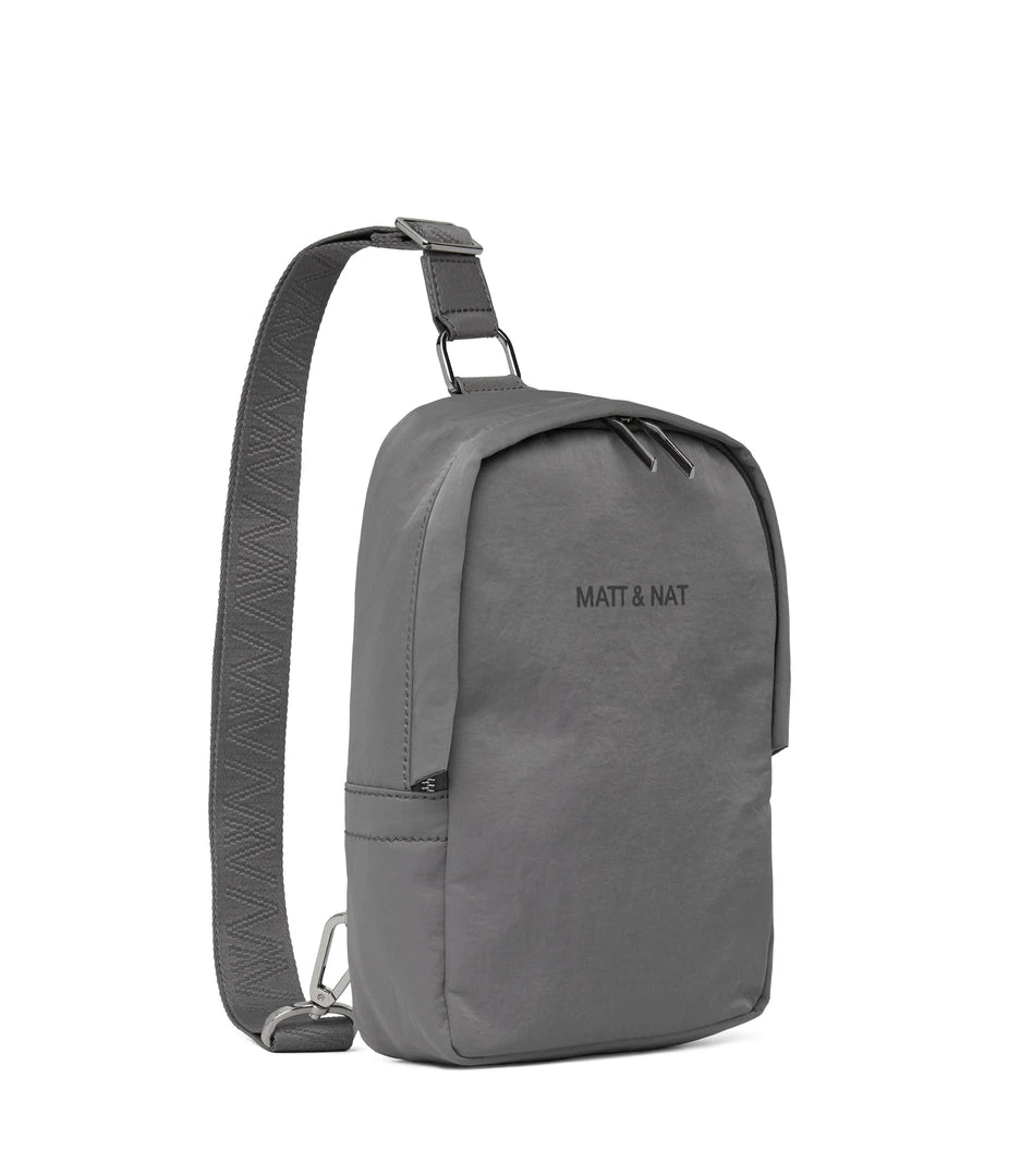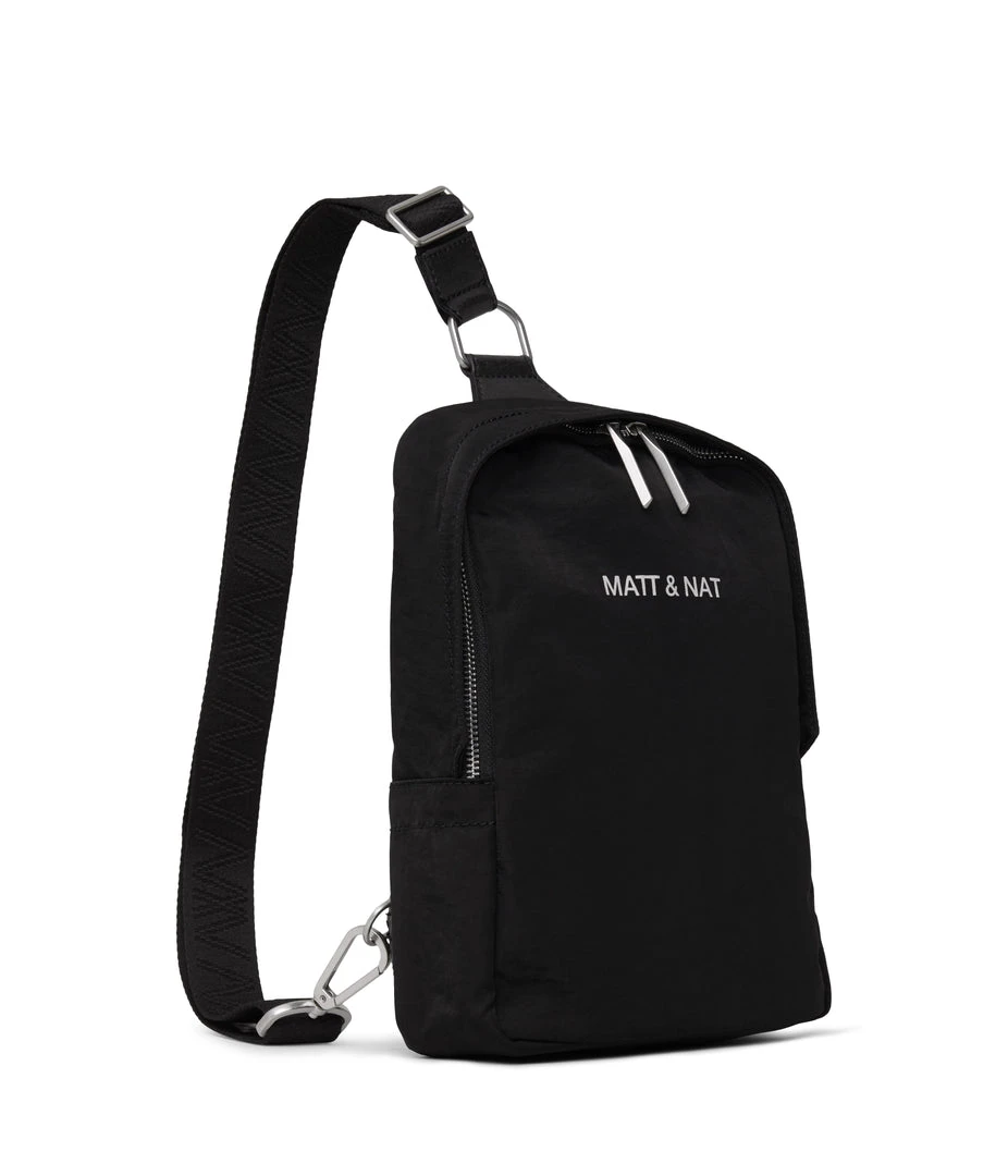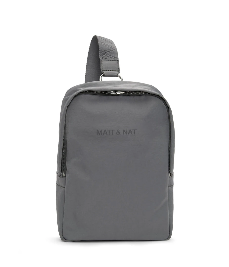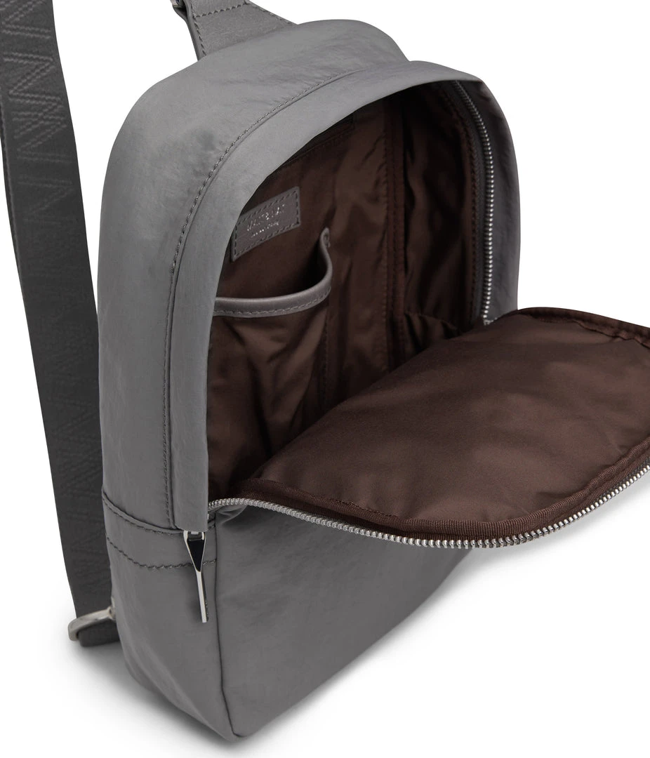 Sling bag with concealed two-way zipper closure, zipper pocket at exterior back, and an adjustable webbing strap which unhooks at the bottom for easier wear.