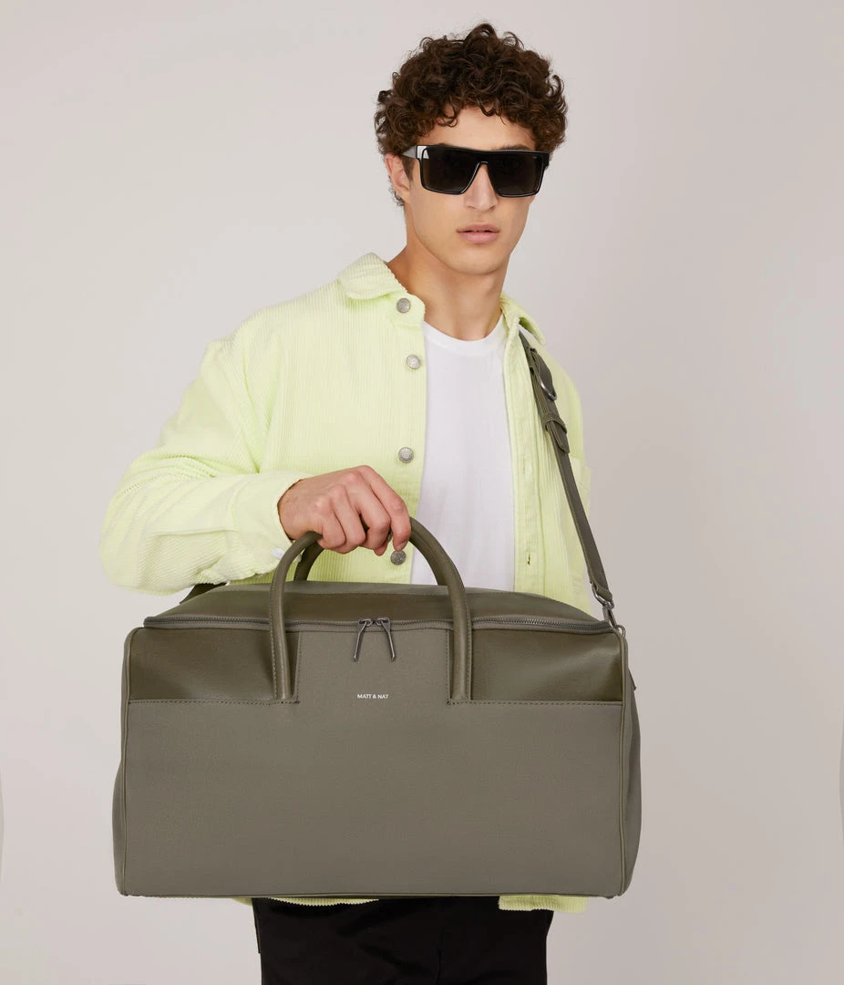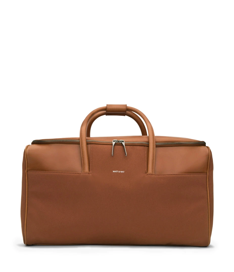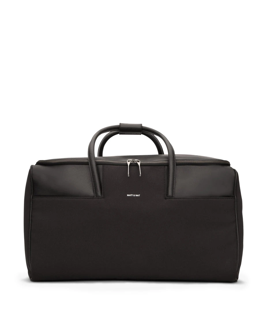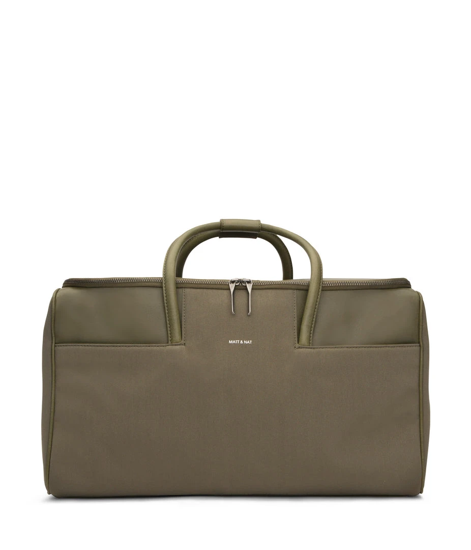 Large weekender that can be worn crossbody with adjustable and removable strap. Zipper closure and front slit pockets. The bag can be completely unzipped to become a garment bag.